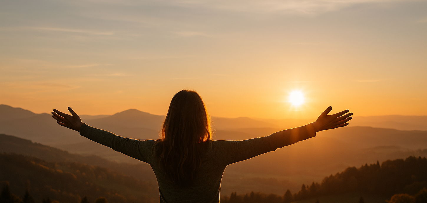 Morgens kurz innehalten und sich glücklich schätzen, hier leben zu dürfen – mit Blick auf Wiesen, bunte Bäume und die Berge am Horizont. ? Ein Spaziergang bei Sonnenaufgang füllt Körper und Seele mit frischer Energie und stiller Freude. ✨ #Dankbarkei